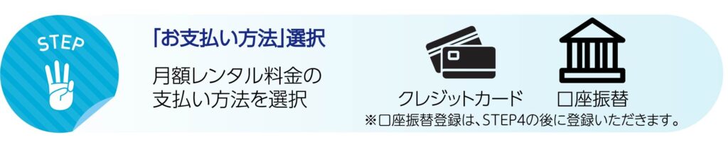 月額レンタル料金のお支払方法を「クレジットカード決済」または「口座振替」から選択してください。なお、お支払いにご利用できるクレジットカードは「VISA・Master・JCB」の3種類となっておりまして、アメックス、ダイナースは対応しておりませんのでご了承のほどお願いいたします。