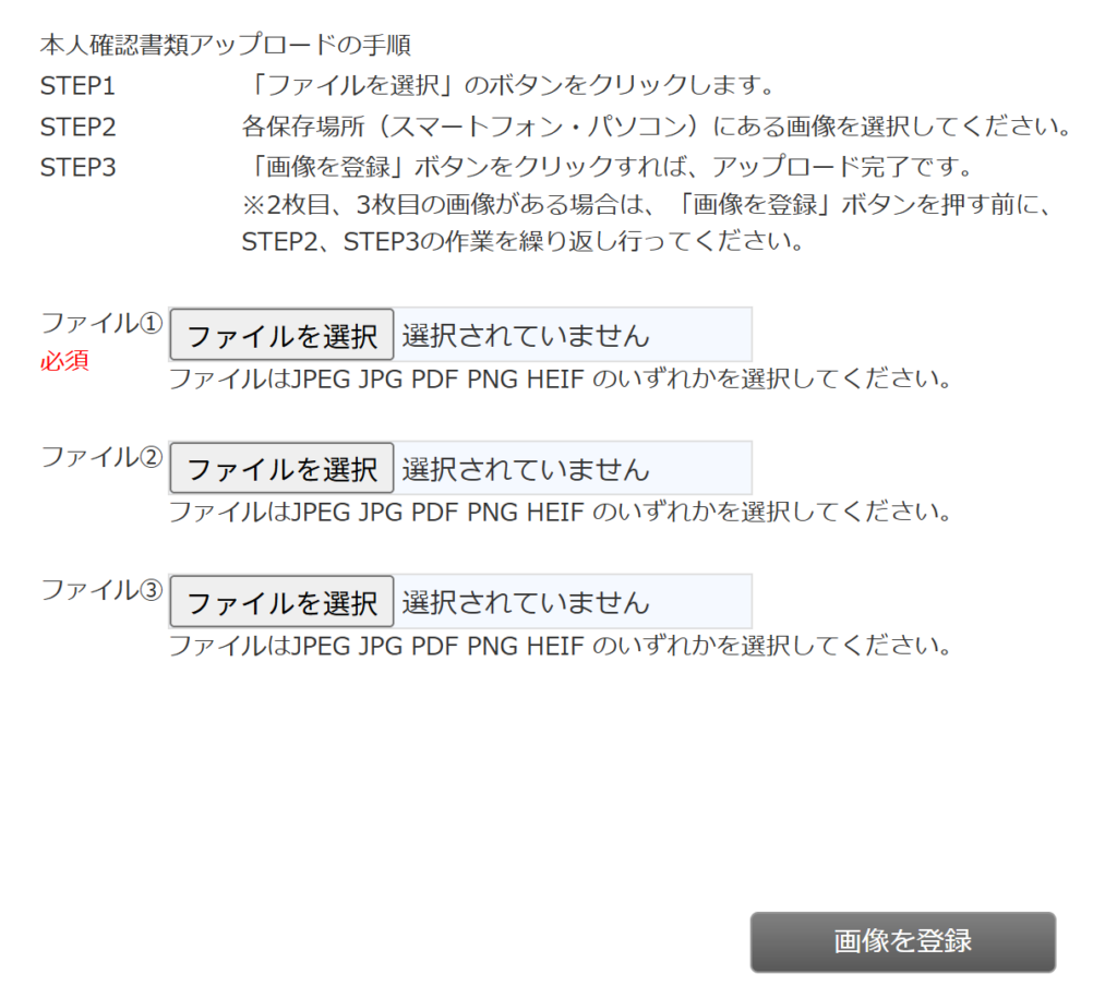 登録したメールアドレス宛に届いているURLからお申込みを進めて頂きますと、ご本人確認書類のアップロードが画面が出て参ります。下記の手順でファイルを選択いただき画像を登録してください。
