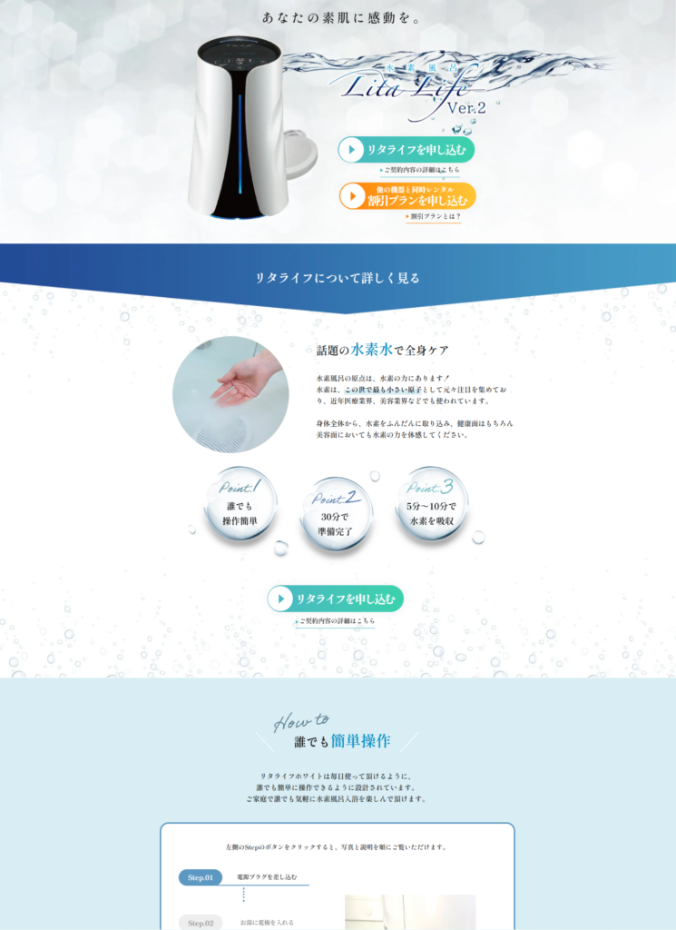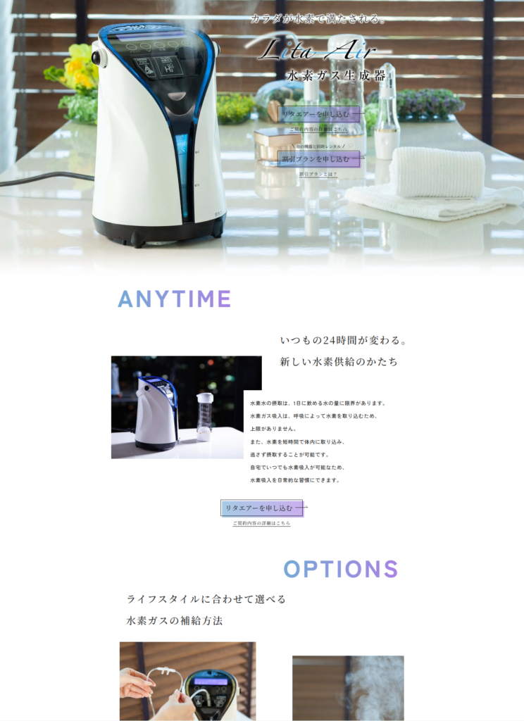 レンタル業務を一括管理する「リタハートインターナショナル株式会社」のレンタル申し込み公式サイトが表示されます。各商品のページには・・・「リタライフを申し込む」「リタエアーを申し込む」「リタアクアを申し込む」という表示以外に「割引プランを申し込む」と言う表示がございます。2台以上同時にレンタル契約をされる方は「割引プランを申し込む」からお進みください。