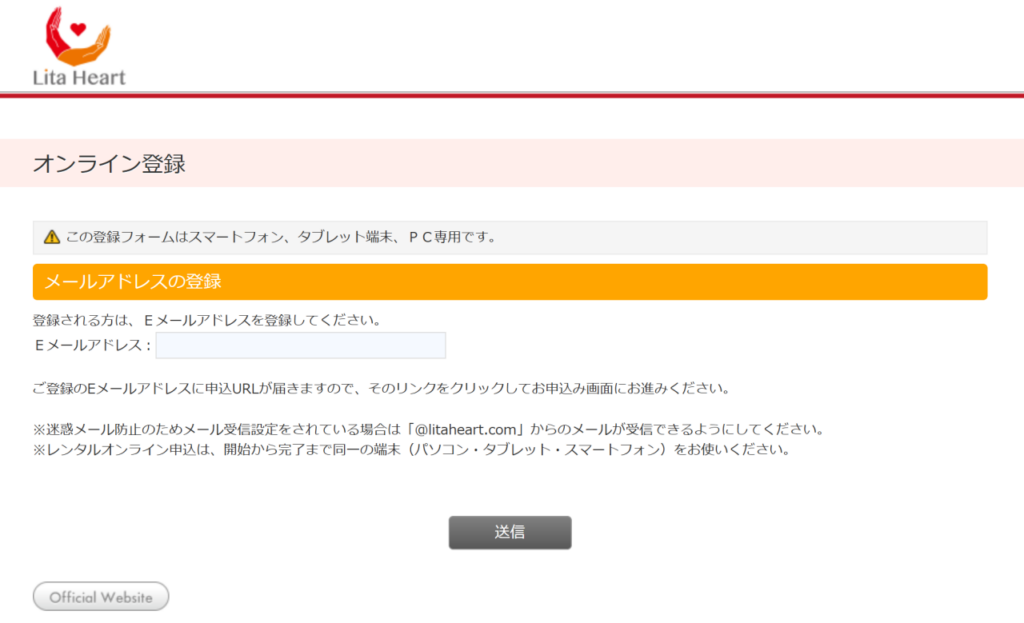 オンライン登録の画面が表示されますので、普段ご利用いただいているメールアドレスをご入力のうえ送信ボタンを押してください。そうしますとご登録のメールアドレス宛てにレンタル申込のURLが届きます。そちらのリンクをクリックしてお手続きをおすすめください。
